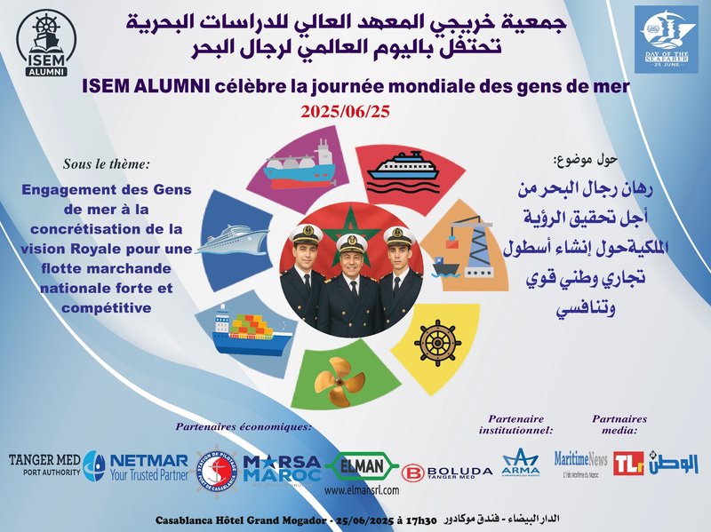 L’Association des Lauréats de l’Institut Supérieur d’Études Maritimes de Casablanca « ISEMAlumni » a le plaisir d’annoncer la célébration de la Journée des Gens de Mer, le mercredi 25 juin 2025, à l’i...